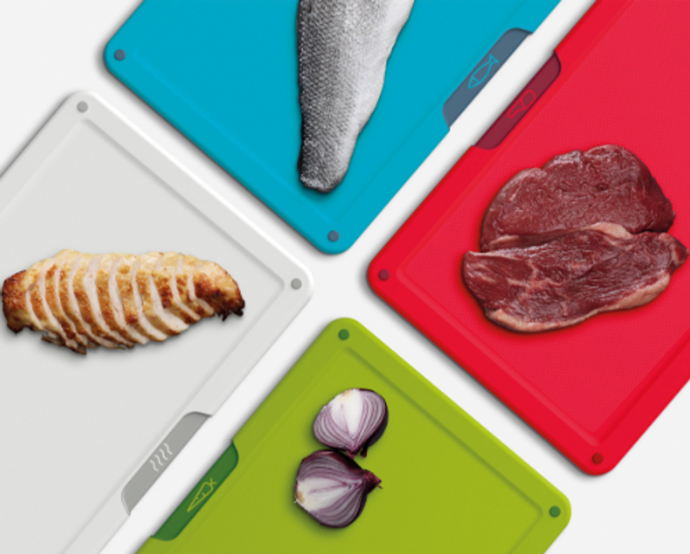Color-coded boards with icons indicating which food type they should be used for - raw meat, raw fish, vegetables or cooked food