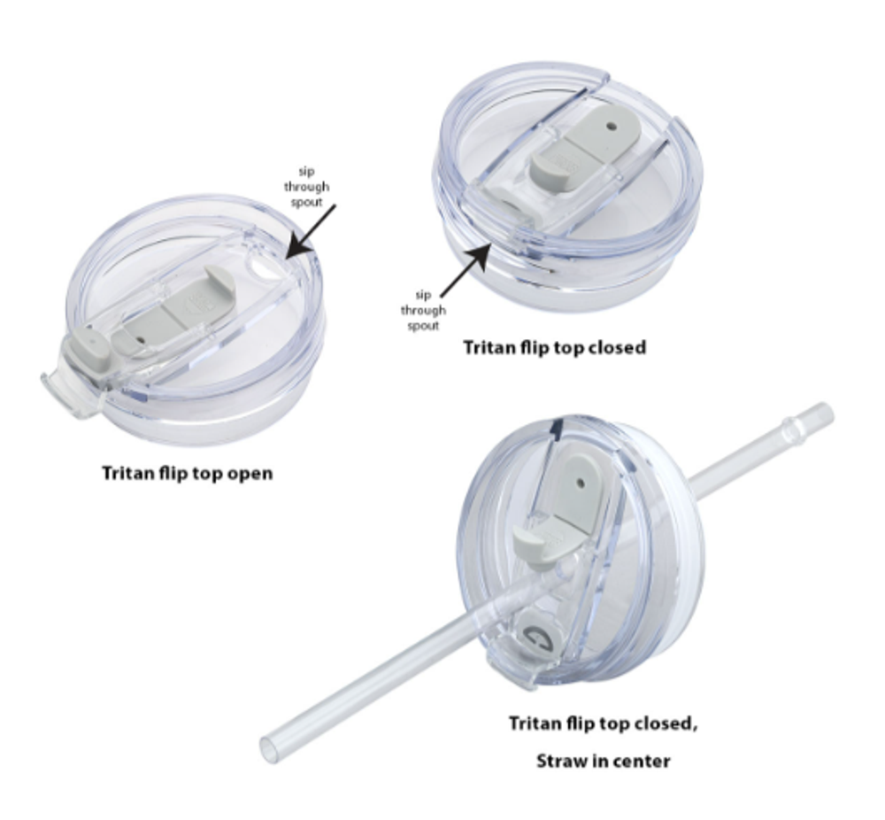 Features a push-on, AS plastic flip top with Tritan snap locking closure lid and straw hole